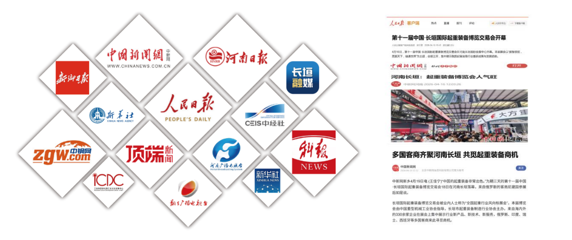 展会邀请人民日报、新华社、中国新闻网、新华财经、顶端新闻、河南电视台、河南日报、新乡电视台、新乡日报、长垣融媒等中央、省、市、县多级媒体全方位报道,通过图文、视频、直播等形式,实时传递展会动态,扩大行业传播覆盖面,提升长垣起重产业整体品牌形象。